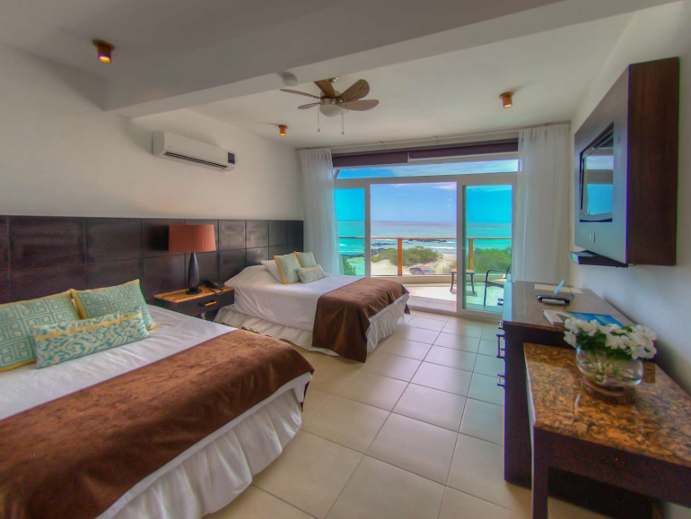 Our ocean-view rooms provide a cozy and family-friendly atmosphere, featuring two double beds, perfect for couples or families with young children. Each room is designed to ensure maximum comfort for our guests during their exciting tour in the Galápagos. Enjoy the beauty of the ocean from the comfort of your room!